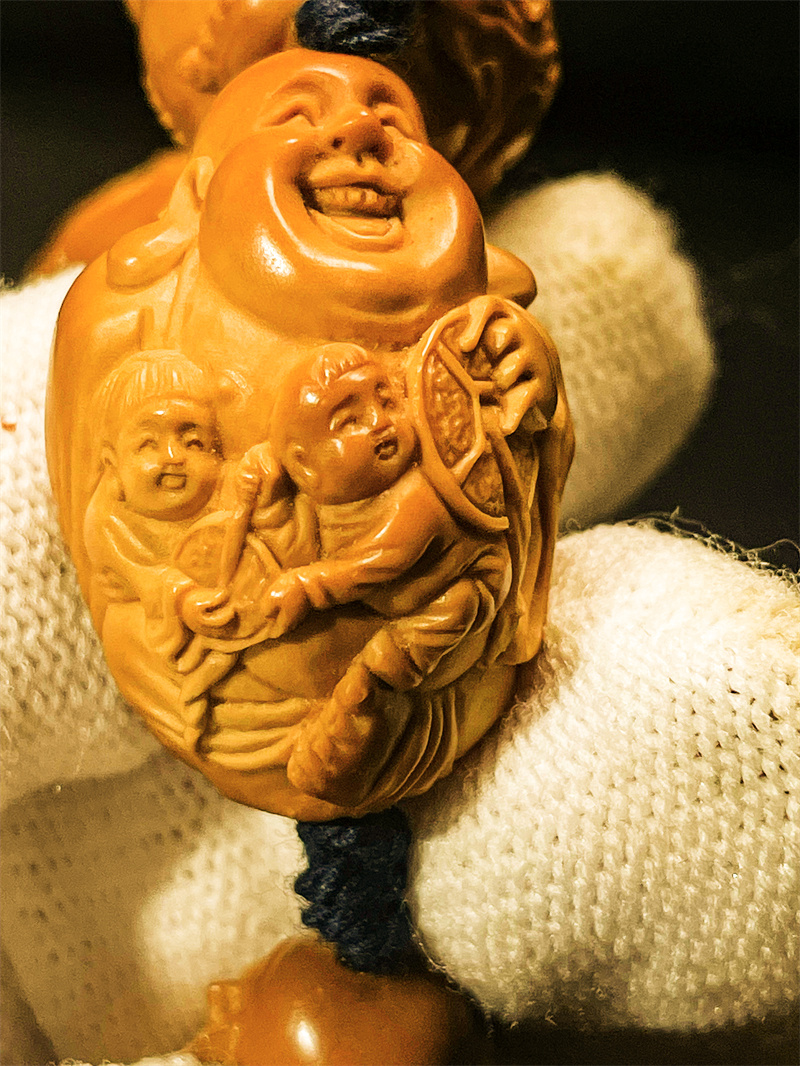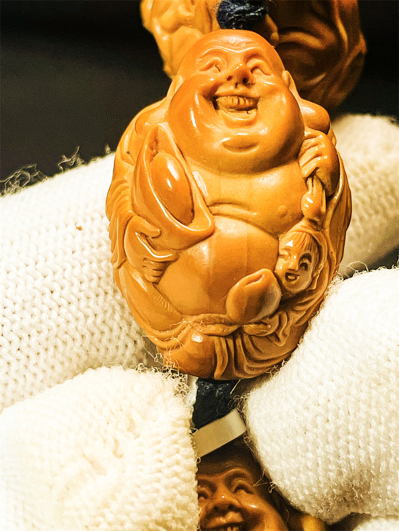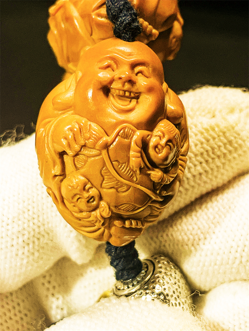弥勒佛本身象征福气安康,其“佛”谐音“福”,寓意代代有福、福泽绵延。双童子形象进一步强化了“多子多福”的吉祥寓意,寄托了家族兴旺、福气连连的美好愿望。