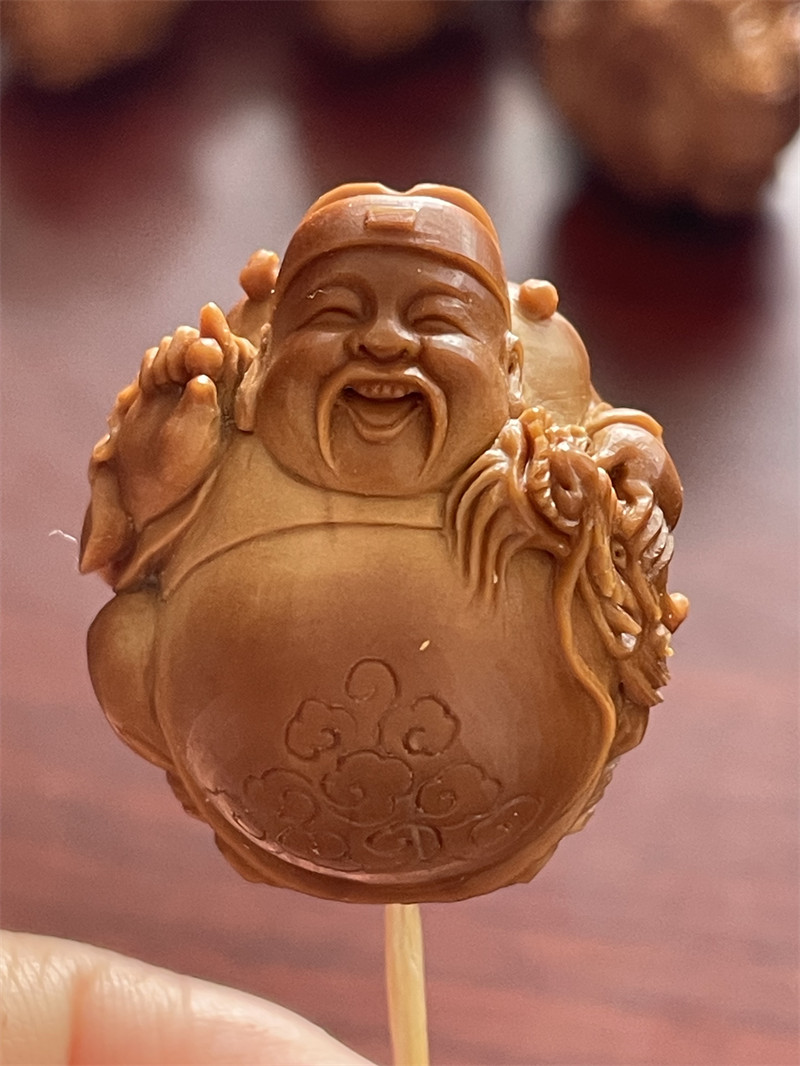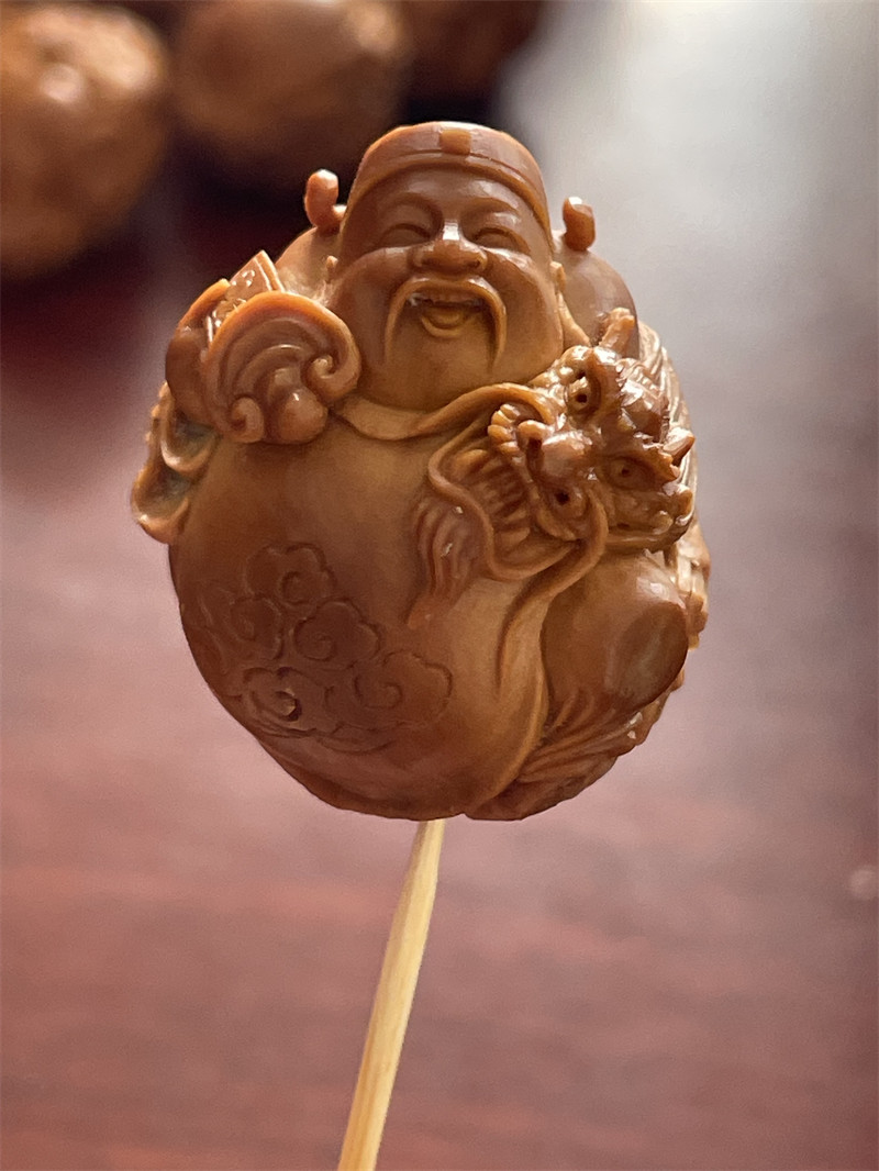 “御龙财神”是一种将传统财神形象与龙元素相结合的雕刻题材,寓意招财纳福、权势与祥瑞。