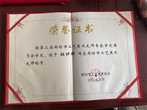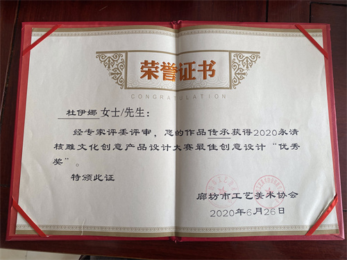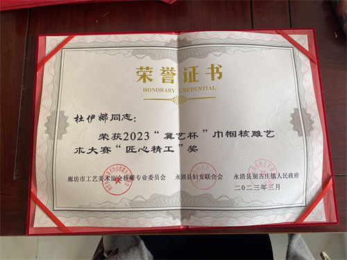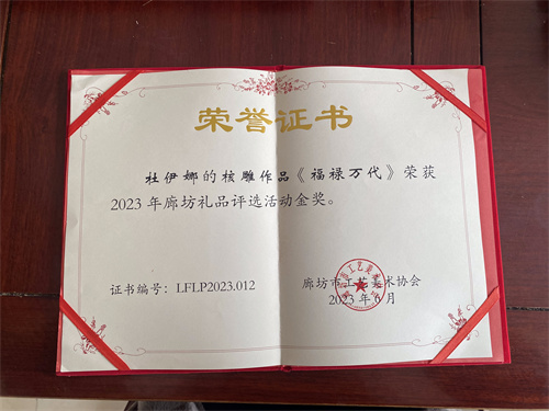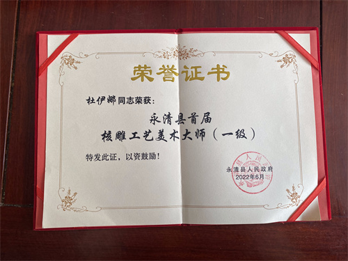 杜伊娜:一级核雕工艺美术大师。深耕核雕行业十余年,她多次参加国家级、省级核雕赛事并获奖,2019 年在中国・永清第二届核雕技艺大赛中获全国铜奖。2022 年,她凭借作品《醒狮》获评一级核雕工艺美术大师,杜伊娜的创作以传统题材为主,擅长通过细腻的浮雕与镂空技法展现文化意象。
