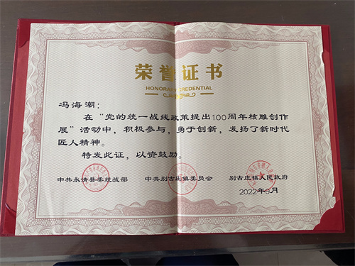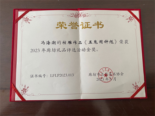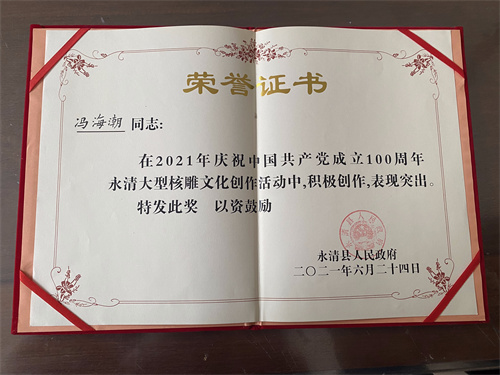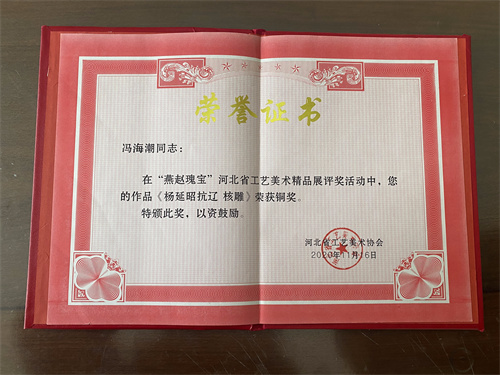冯海潮:核雕领域的青年代表人物,以精湛的技艺和创新的创作理念在行业内崭露头角。2019 年中国工艺美术协会主办的中国・永清第二届核雕技艺大赛荣获全国铜奖,2020 年核雕文化创意产品设计大赛中荣获最佳创意设计精品奖,2021 年建党百年大型核雕创作献礼入选作品(官方专题展览)